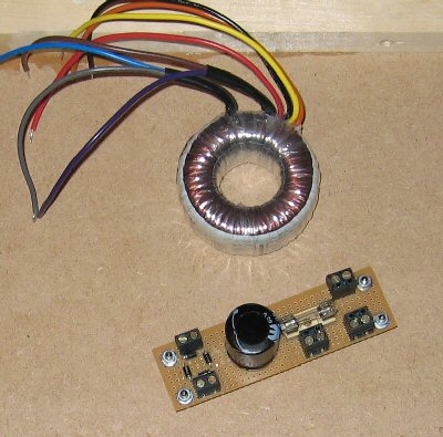 Here's the AC to DC converter (for the microcontroller) and the toroidal transformer. It's not much too look at really. It's just a bridge, fuse and cap.