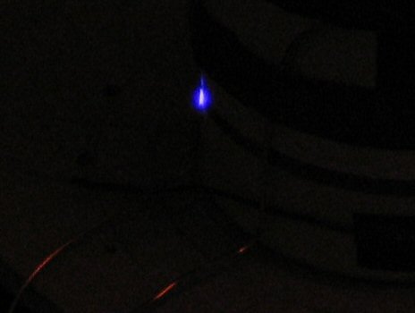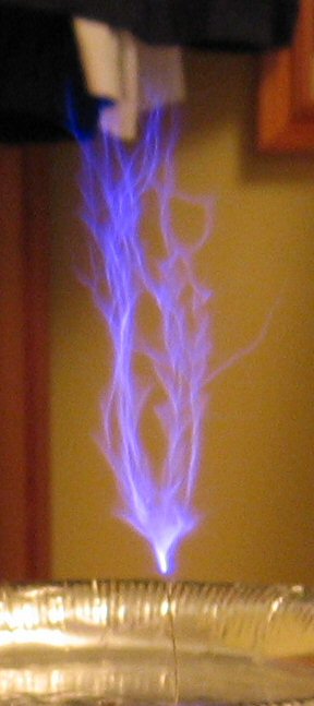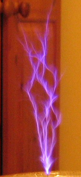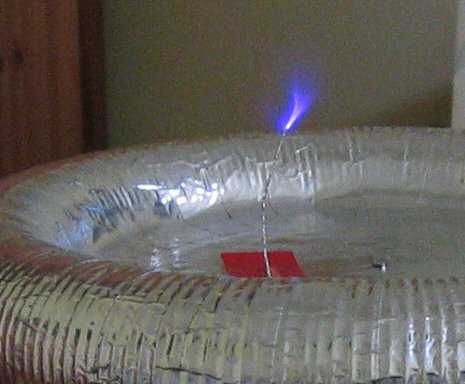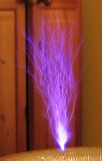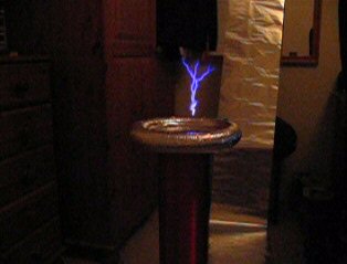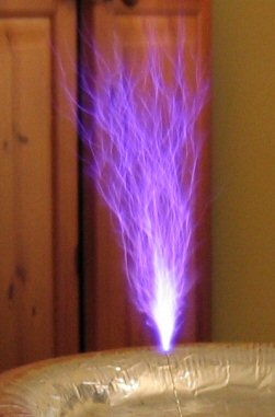 Monday 28 March 2005The emergency blanket RF ground still arcs over. It only does it some of the time though. It might be due to the fact that the foil on the blanket is very very thin. I've now replaced the blanket with aluminium tin foil, which is much thicker. I'll see if it also arcs. Interestingly, the arcs from the top load aren't as good with the tin foil RF ground as they are with the blanket. Although the blanket is bigger than the tin foil. Here's a small video clip of the RF ground arcing (turn the volume up to hear it):Here's a picture of a small arc coming from the top load (they will get much bigger):