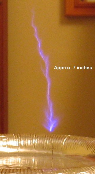 The camera flash has made it look quite patchy, but in normal light it's not really noticable. Initially I think the new top load will be too big, but it's worth experimenting with. I can't use it yet as I'm still performing tests with the smaller top load. I've also got to recalculate the resonant frequency as the extra capacitance will make quite a difference. I've been performing more tests with different primary windings. I'm now getting bushier arcs. I'm still in the process of setting up a new webpage with pictures and videos of the tuning process. Here's a picture in the meantime.