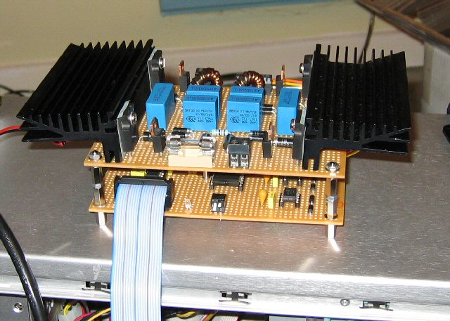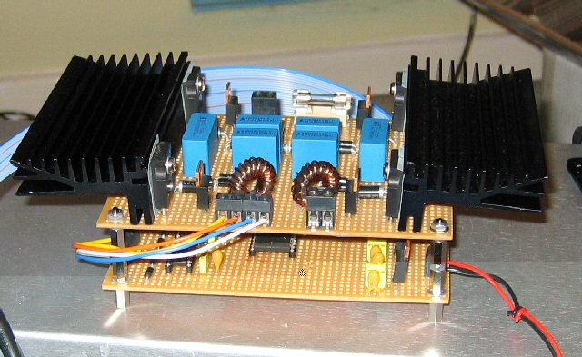 Thursday 20 January 2005Didn't really do much today. I bought some MDF to make the base and I also ran the gate driver transformers with a frequency of 300KHz (much higher than I will need). The transformers could easily handle it. I've noticed that the MOSFET driver IC's get really hot . That does suggest that something is wired up incorrectly. I'll have to investigate further. I looked around for a primary coil form and the only thing I could find was a plastic pot of paint. I may buy it tomorrow and sand and clean it. I could then wrap the primary around it. I'm not yet sure what wire I'm going to use for the primary.Here's the completed boards connected together. The ribbon cable is for the SP12 programmer and the RS232 link.