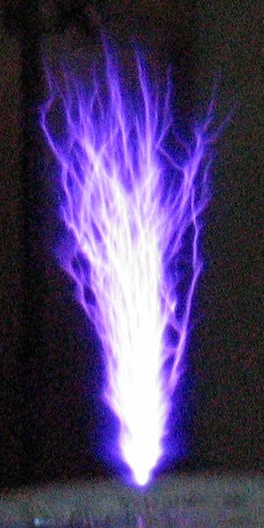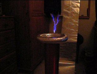 Tuesday 29 March 2005Today I bought some aluminium ducting. I can use this to create a much bigger top load. Generally SSTC's don't perform well with large top loads, but I think it's worth experimenting with. I'll construct the top load over the next few days.Here's a video of the new large arc (< 500KB): Here's 2 interesting stills from the above movie. You can see the RF ground in the background. The arcs in the pictures are over 7 inches long (they will get much bigger).