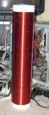 Thursday 24 March 2005Here's the new primary coil (the white is paper is the primary coil is held in place with insulating tape):