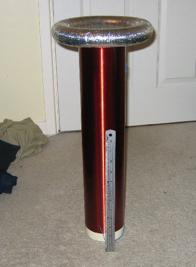 Tuesday 25 January 2005After many hours of marking out, sawing, sanding, more marking out and drilling I finally had all of the woodwork finished. Once the sawdust had settled (I should really have done it outside) I got to work glueing and screwing it all together. I then stepped back and looked at my woodwork creation. It looked really bad. It looked so bad I didn't even take a photo of it. Tomorrow I'm going to cut 2 new MDF platforms and start again. My mistake was trying to make too complicated a structure. Tomorrows attempt will just use 2 MDF platforms with metal screw rod for legs (like the variac). The screw rod will allow for height adjustments and will be much simpler to put in place. I hope to have the base unit finished tomorrow.Now the varnish on the coil is completley dry it looks really good. I should be able to perform my first coil test early next week (Monday or Tuesday). The results should be good. Here's the coil with the topload attached (it looks much better in real life than in the photo):