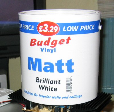 Friday 21 January 2005Didn't do much today either. I bought a cheap plastic pot of paint which will make up the primary coil form. I've cleaned the pot out and have sanded most of the advertising off. It's quite smooth and most of the advertising has gone. Tomorrow I will either continue sanding or I will just spray it with white spray paint. I've cut the plastic paint lid to the same diameter as the secondary coil form. This will be super glued to the secondary coil form tomorrow and it will allow the top load to be connected.